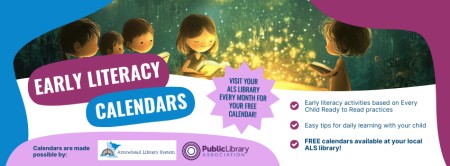 Pick up a free monthly early literacy calendar provided by Arrowhead Library System. These calendars have simple, daily activities for caregivers to build fundamental reading skills in children ages 0-5.