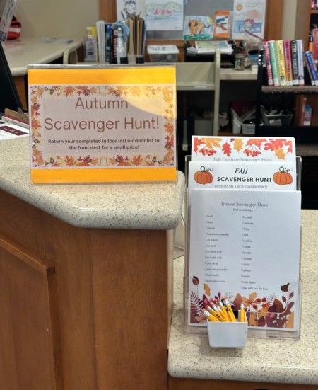 During the month of November, we are have indoor and outdoor scavenger hunts for kids/teens to seek and find! Participants will receive a small prize upon finishing their lists and returning to front desk staff. So, come and get your hunt on!!